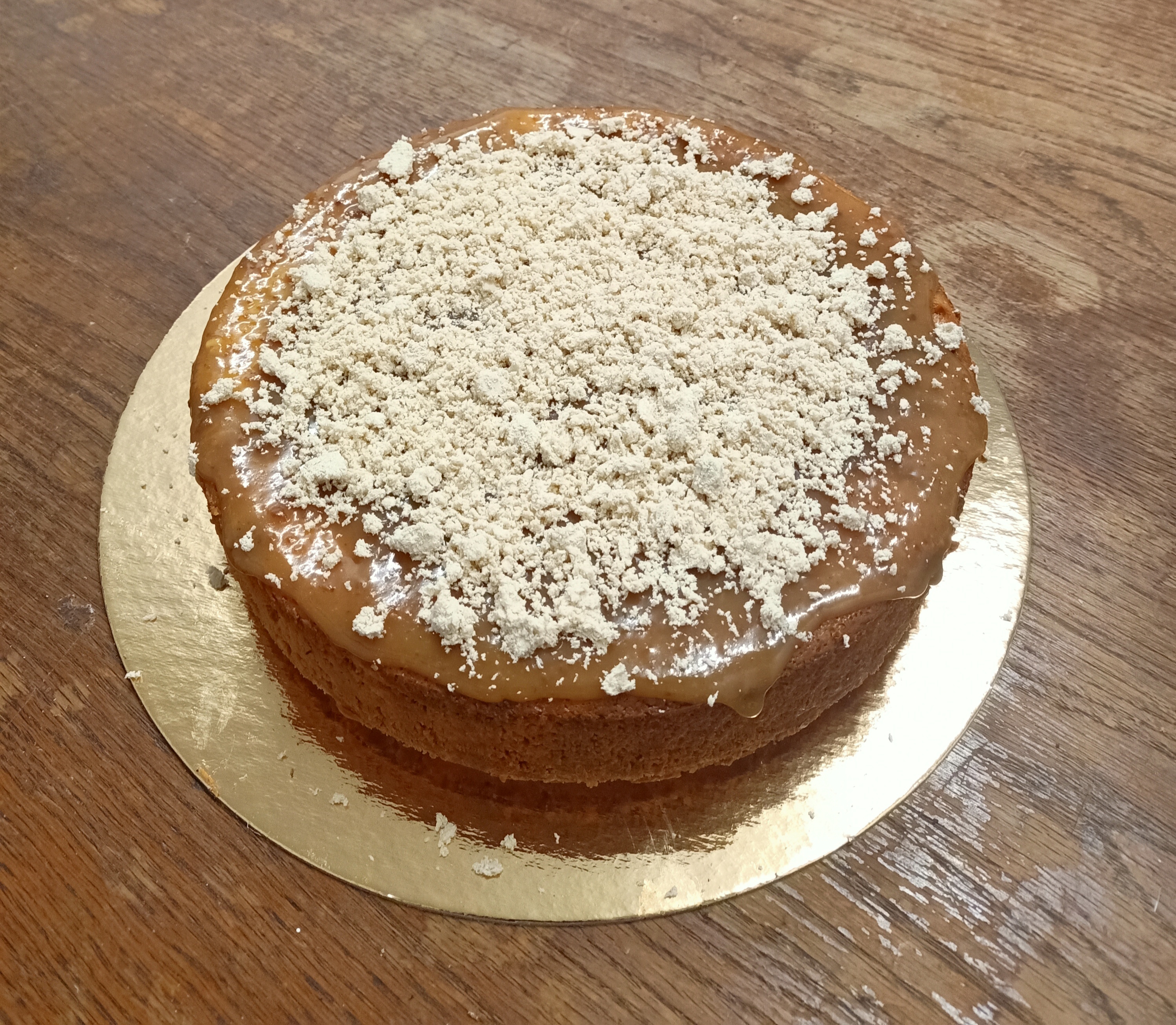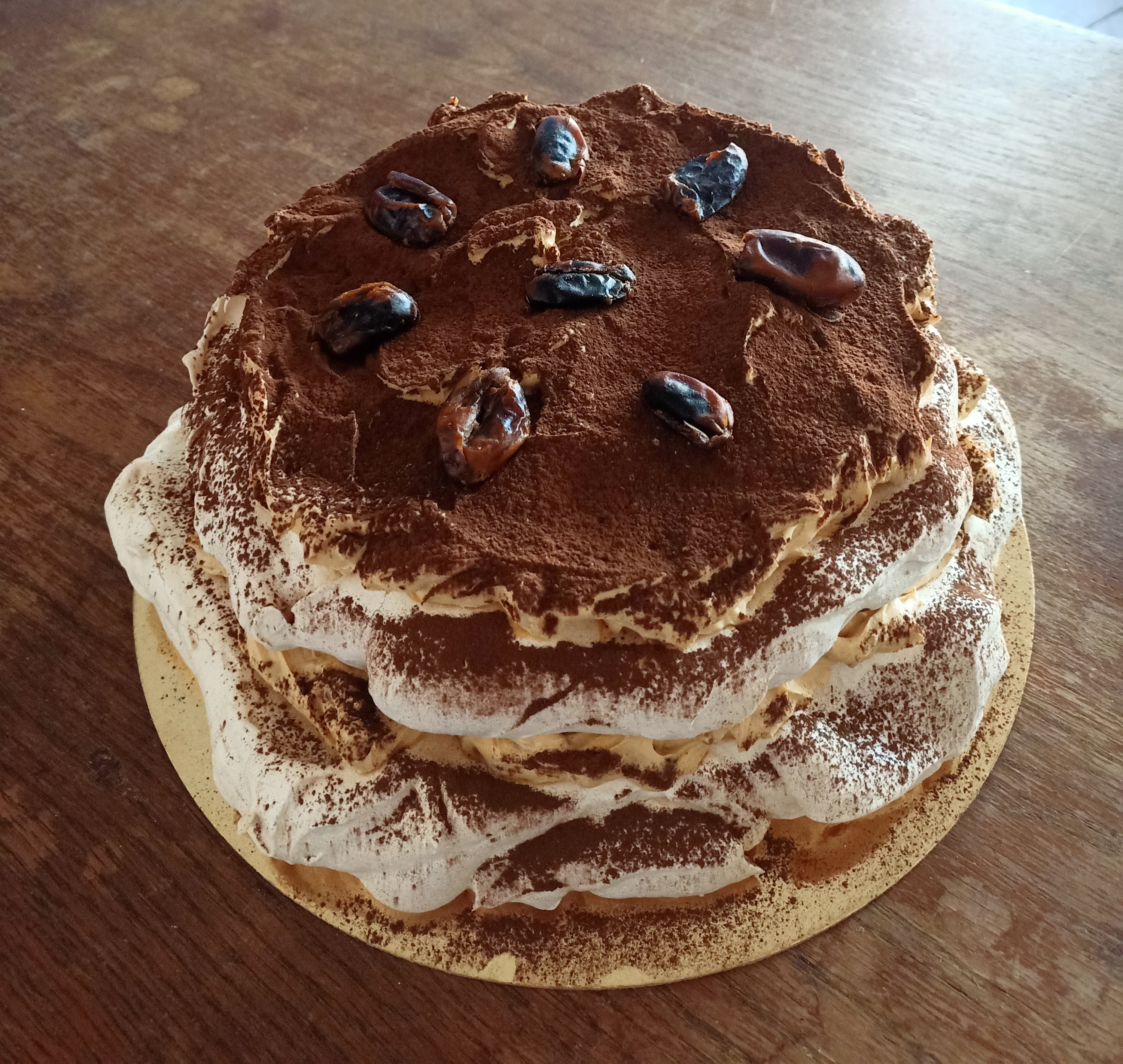 2 bezowe korpusy z dodatkiem daktyli i cukru trzcinowego, krem na mascarpone z kajmakiem, orzechami oraz suszonymi daktylami