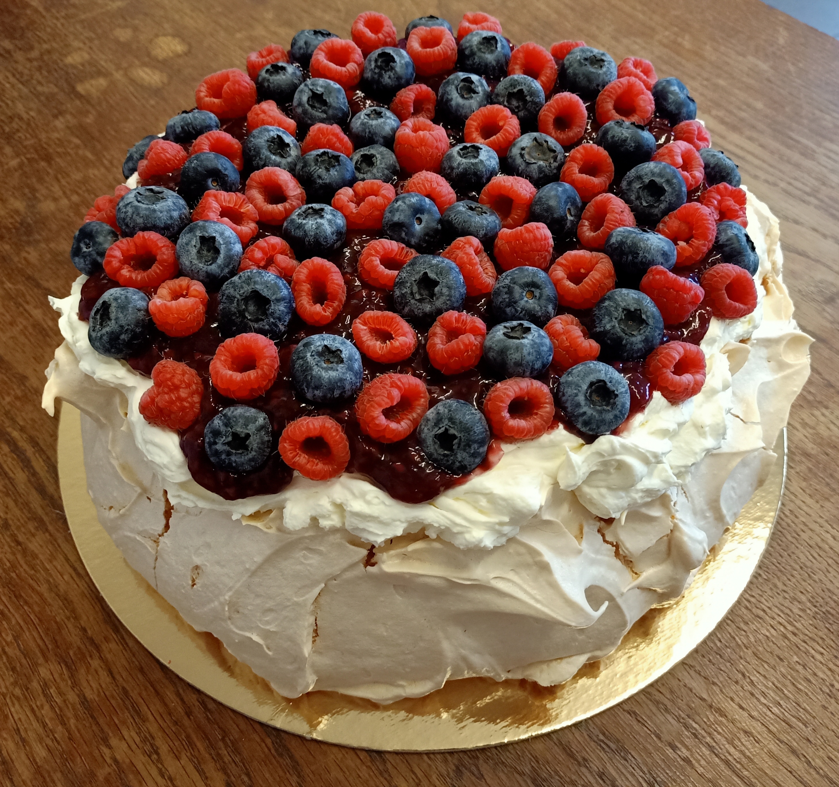 beza wypełniona śmietaną z mascarpone, wykończona frużeliną malinową i świeżymi borówkami oraz malinami