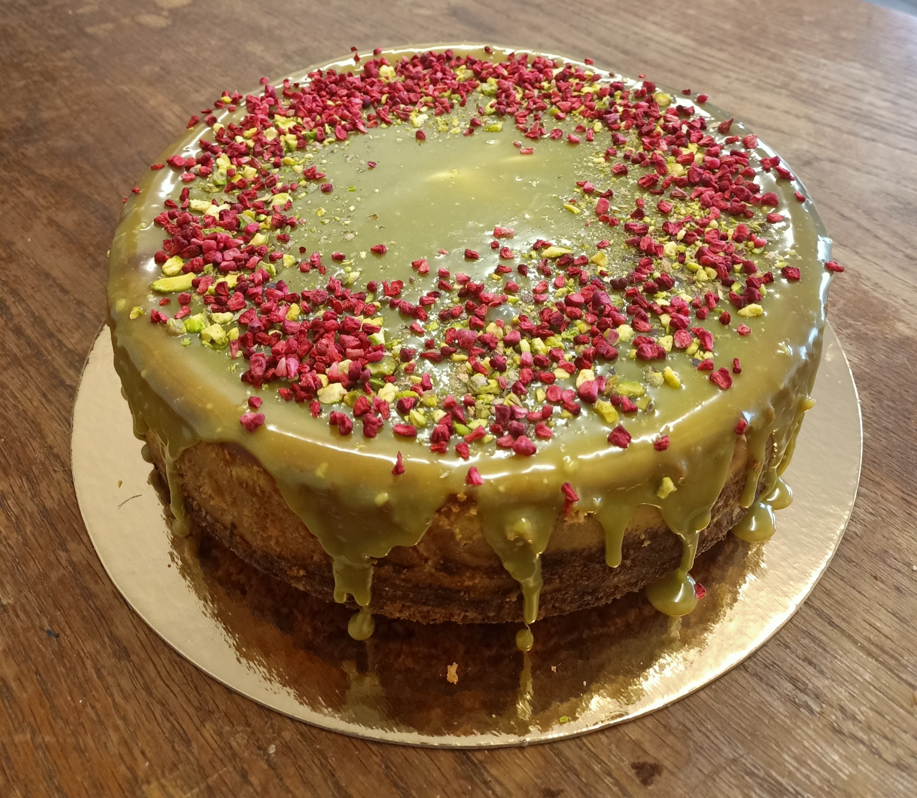 kremowy sernik o smaku pistacji wykończony polewą pistacjową, kruszonymi pistacjami i suszonymi malinami