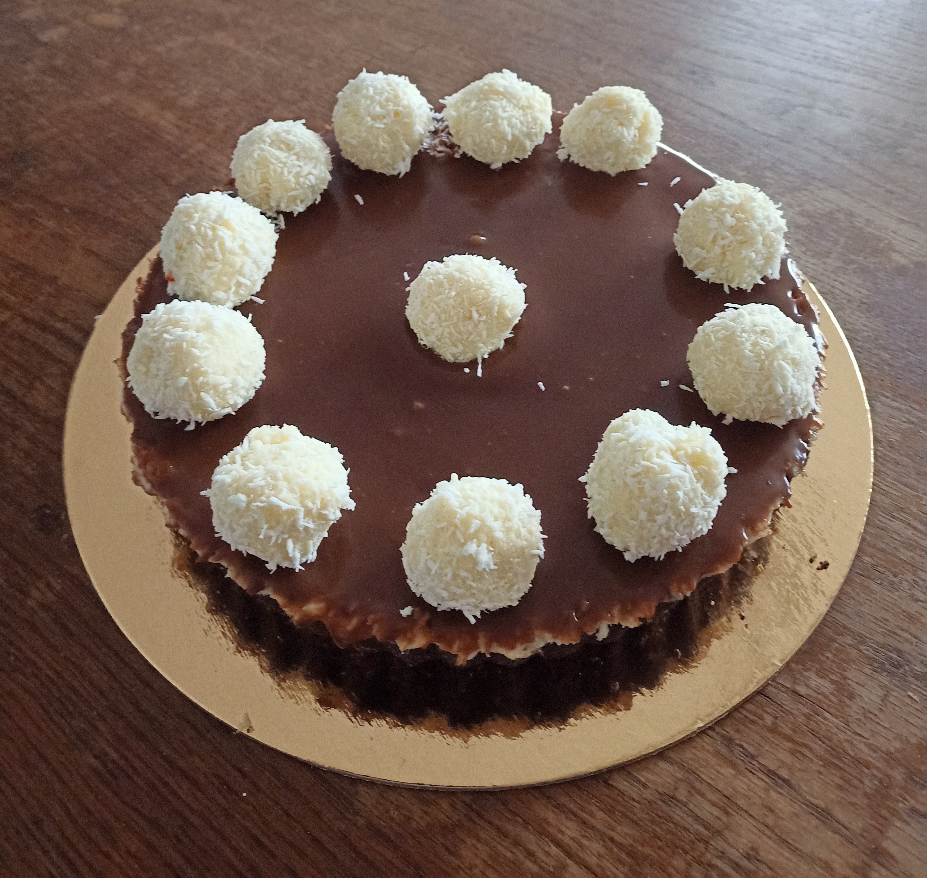 spód z ciastek czekoladowych, nadzienie kokosowe, glazura z mlecznej czekolady i dekoracja w postaci pralinek kokosowych