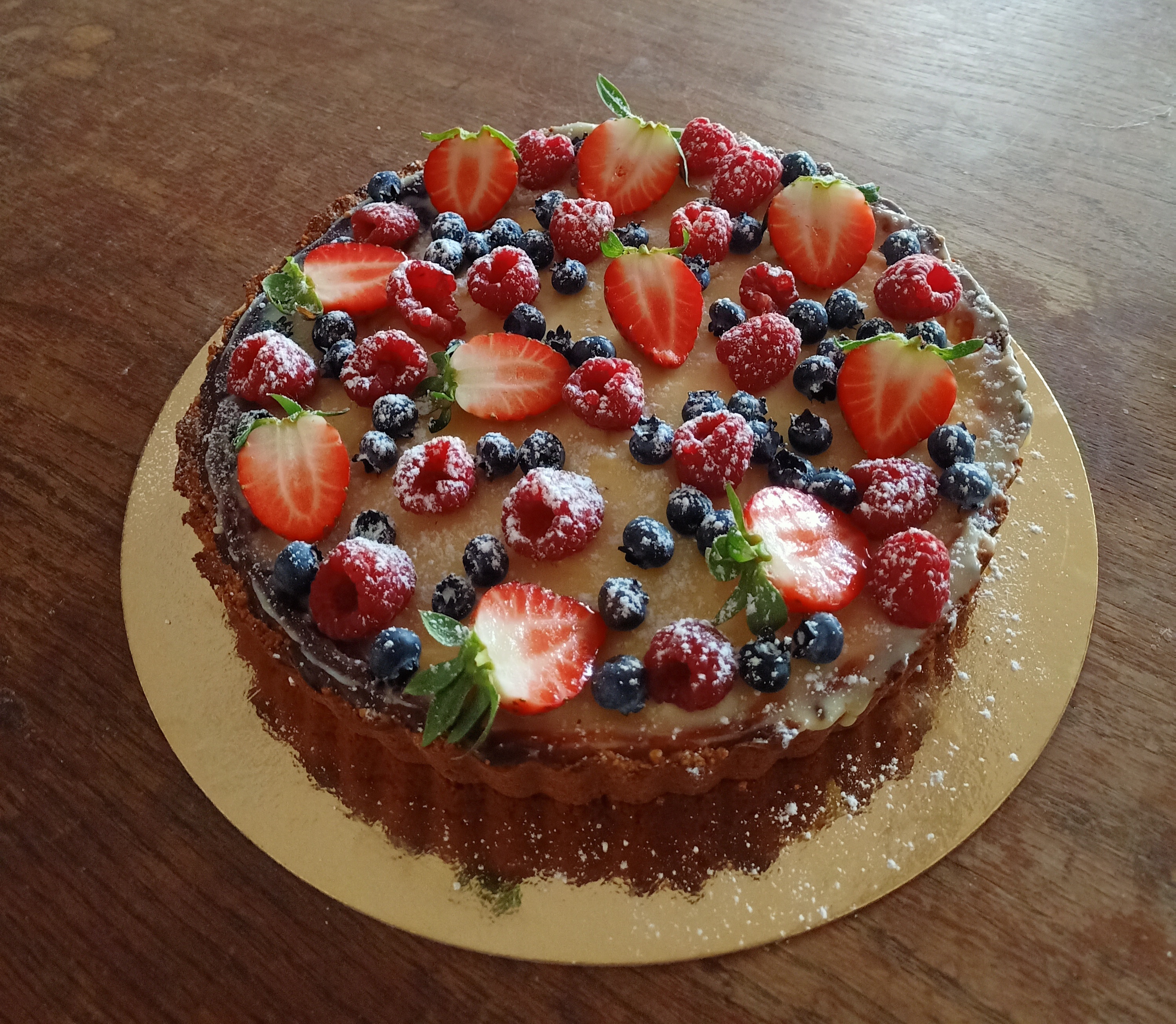 jasny kruchy spód, wilgotna tarta z nadzieniem jogurtowym, wykończona świeżymi owocami, posypana cukrem pudrem