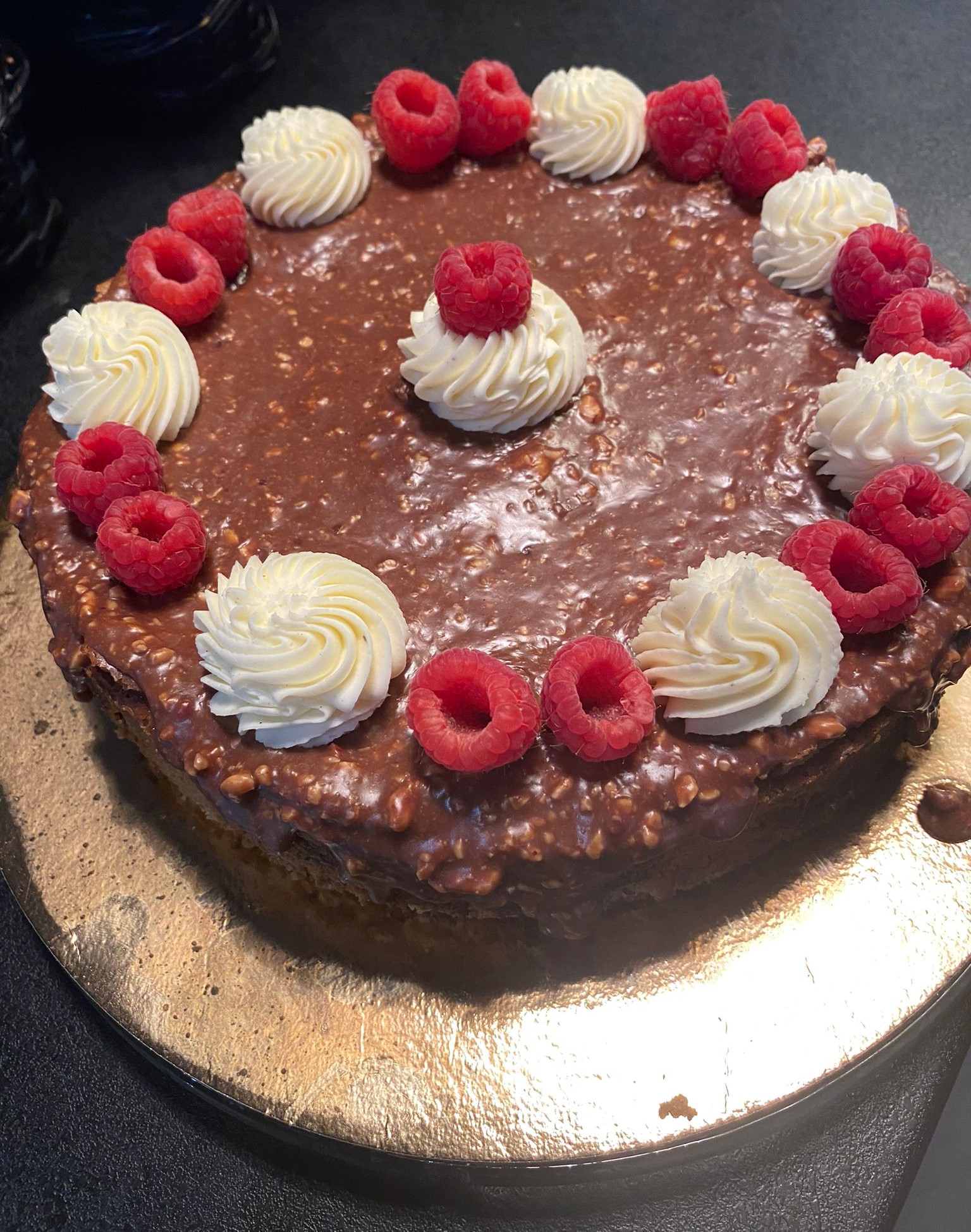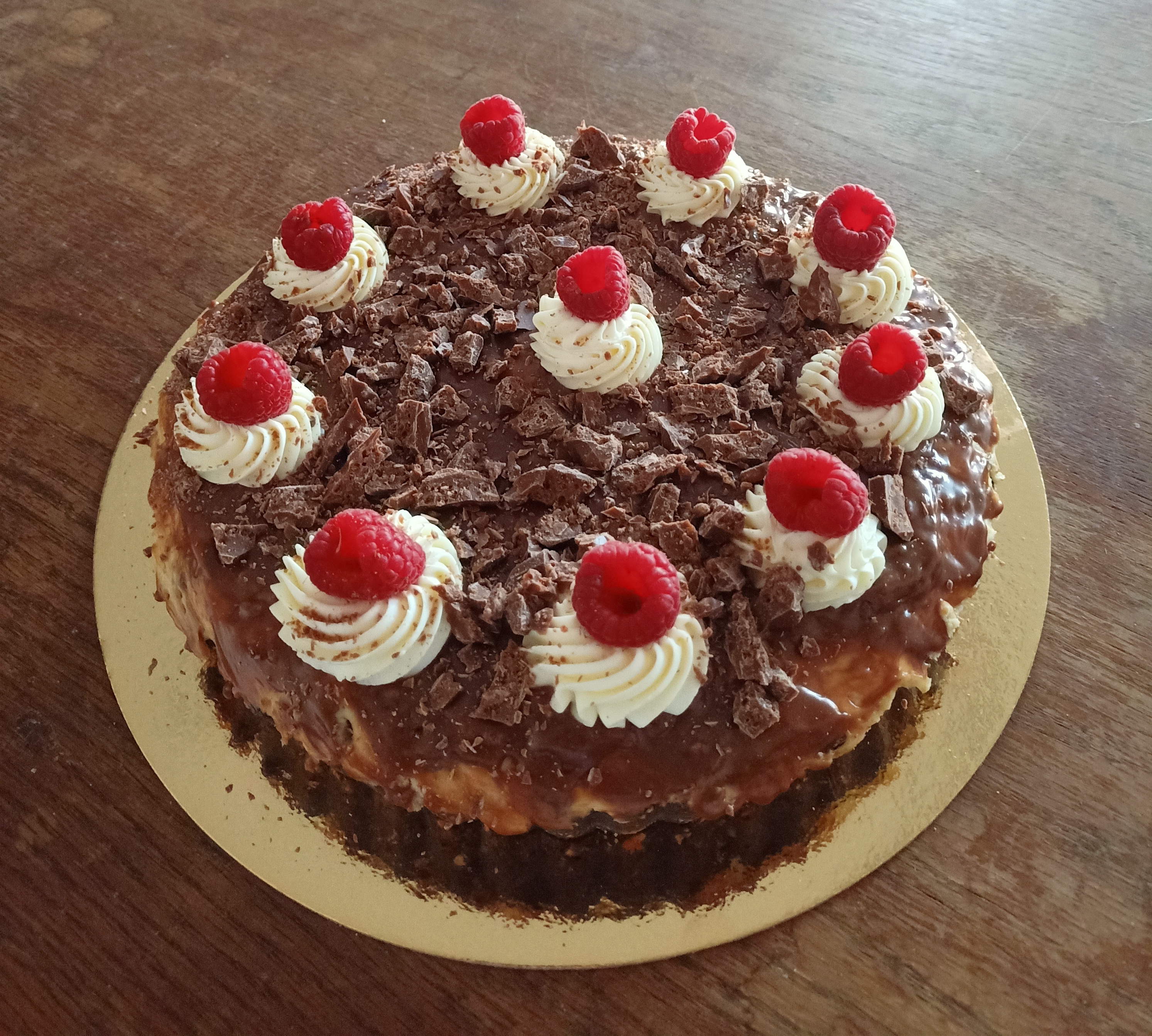 czekoladowo - ciasteczkowy spód, malinowy krem mus w środku, góra wykończona śmietaną i świeżymi malinami