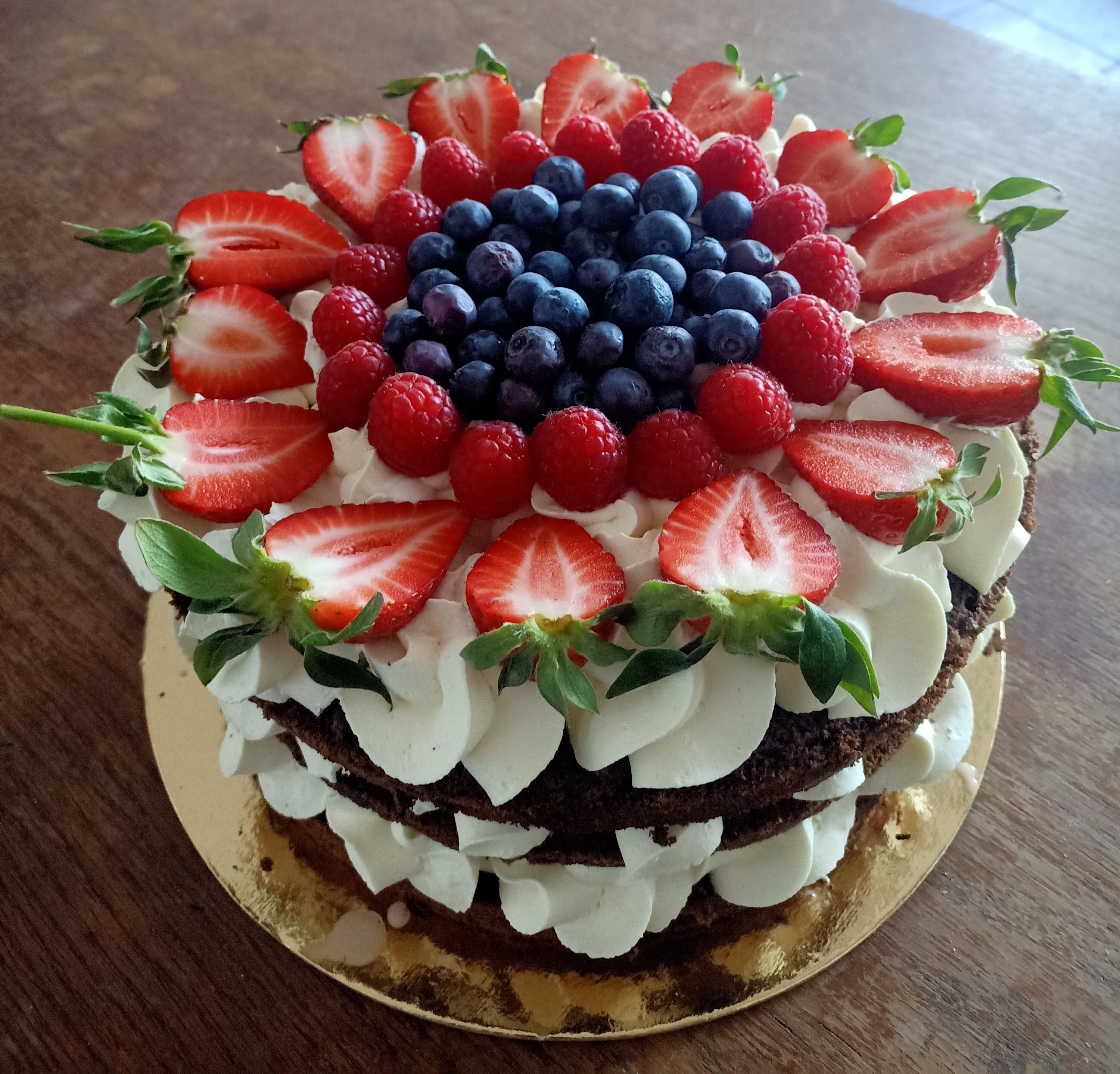 2 wilgotne blaty ciasta czekoladowego przełożone kremem waniliowym z mascarpone, owocowa frużelina, pokruszone ciasto czekoladowe oraz owoce sezonowe