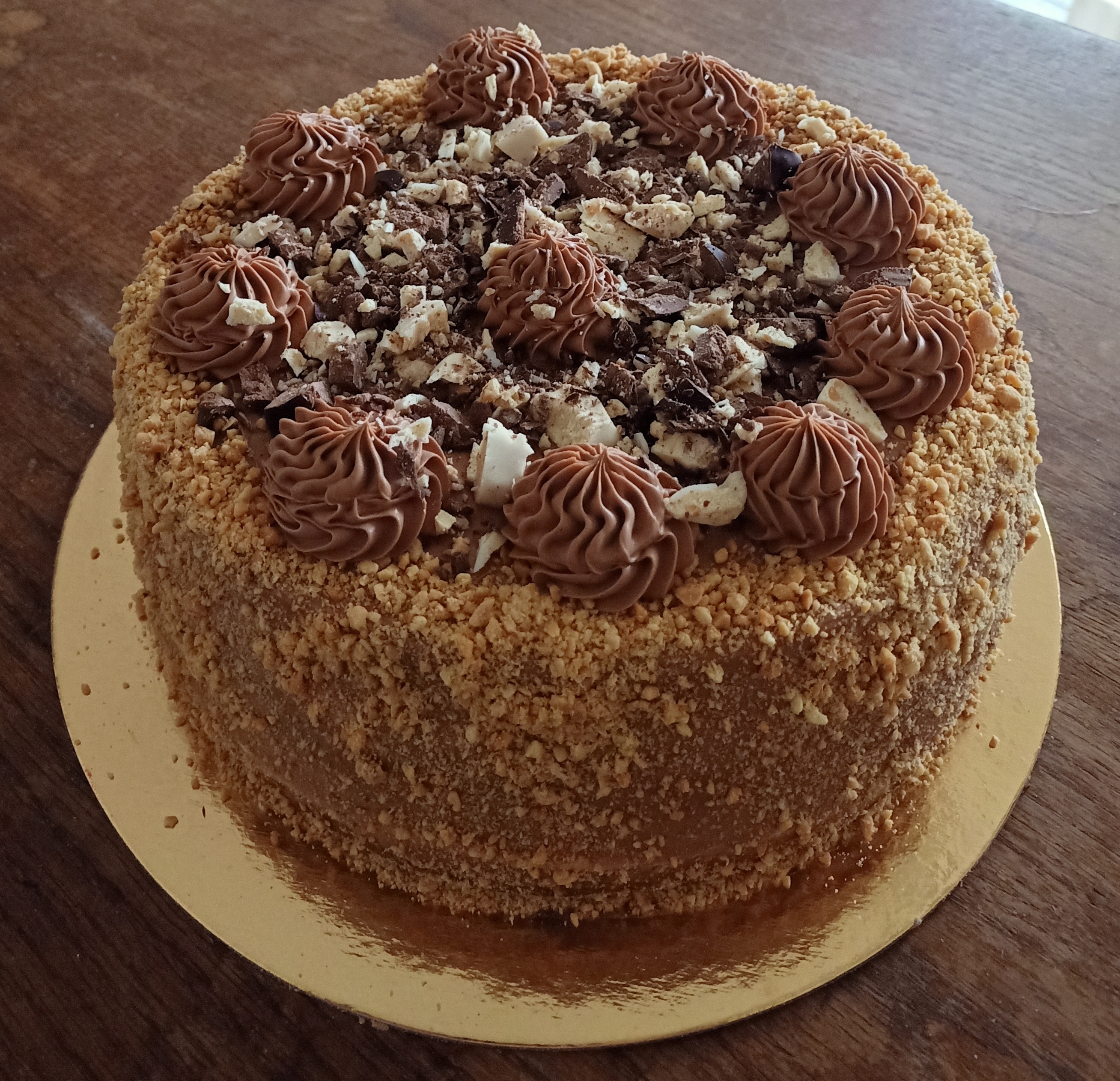 spód z ciastek czekoladowych, nadzienie na mascarpone z dulce de leche, białą czekoladą i batonikiem, wykończone śmietaną z kawałkami batonika i kajmakiem