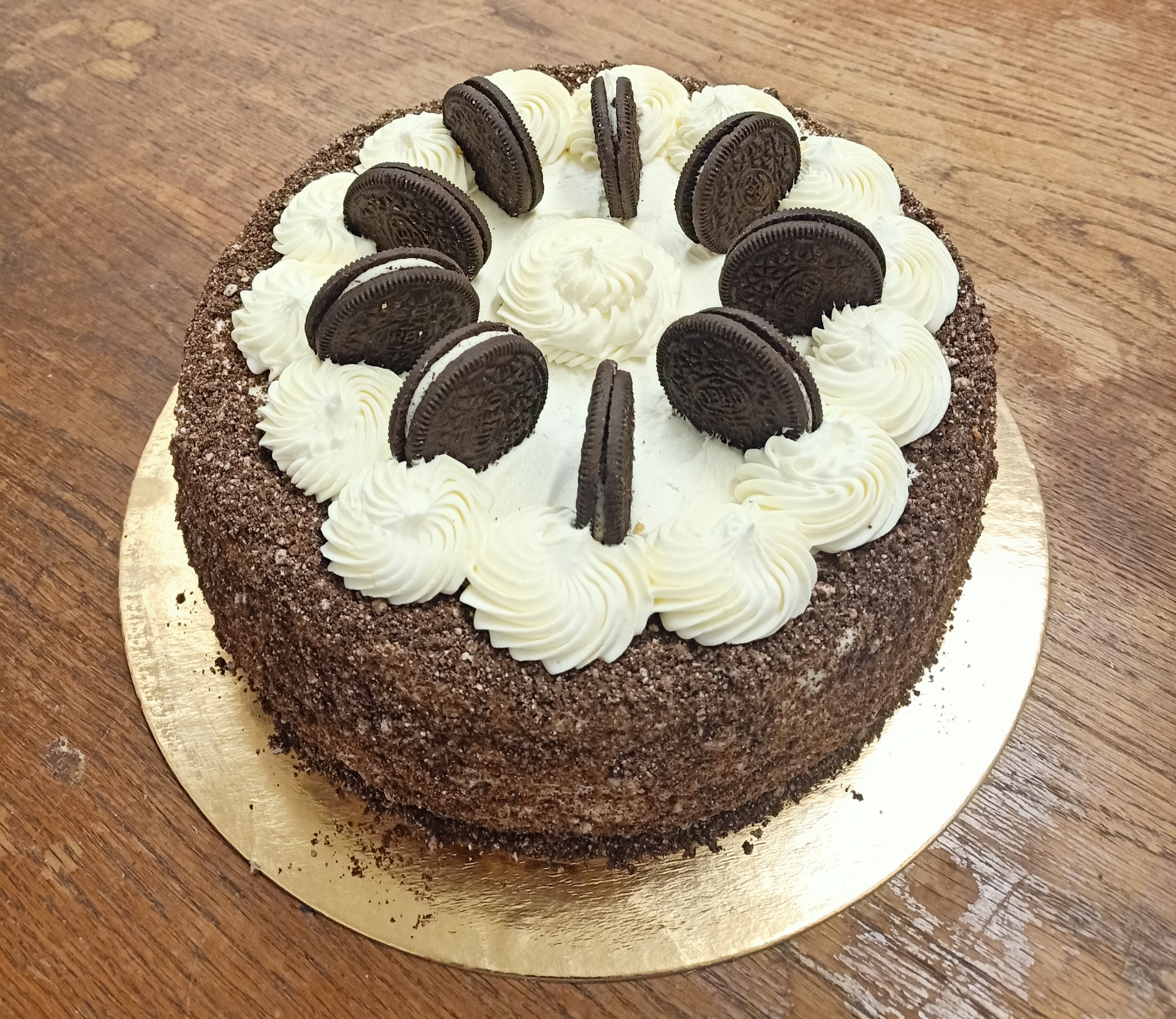 czekoladowe ciasto, waniliowy krem na bazie mascarpone z kawałkami ciastek oreo, posypka z ciastek czekoladowych
