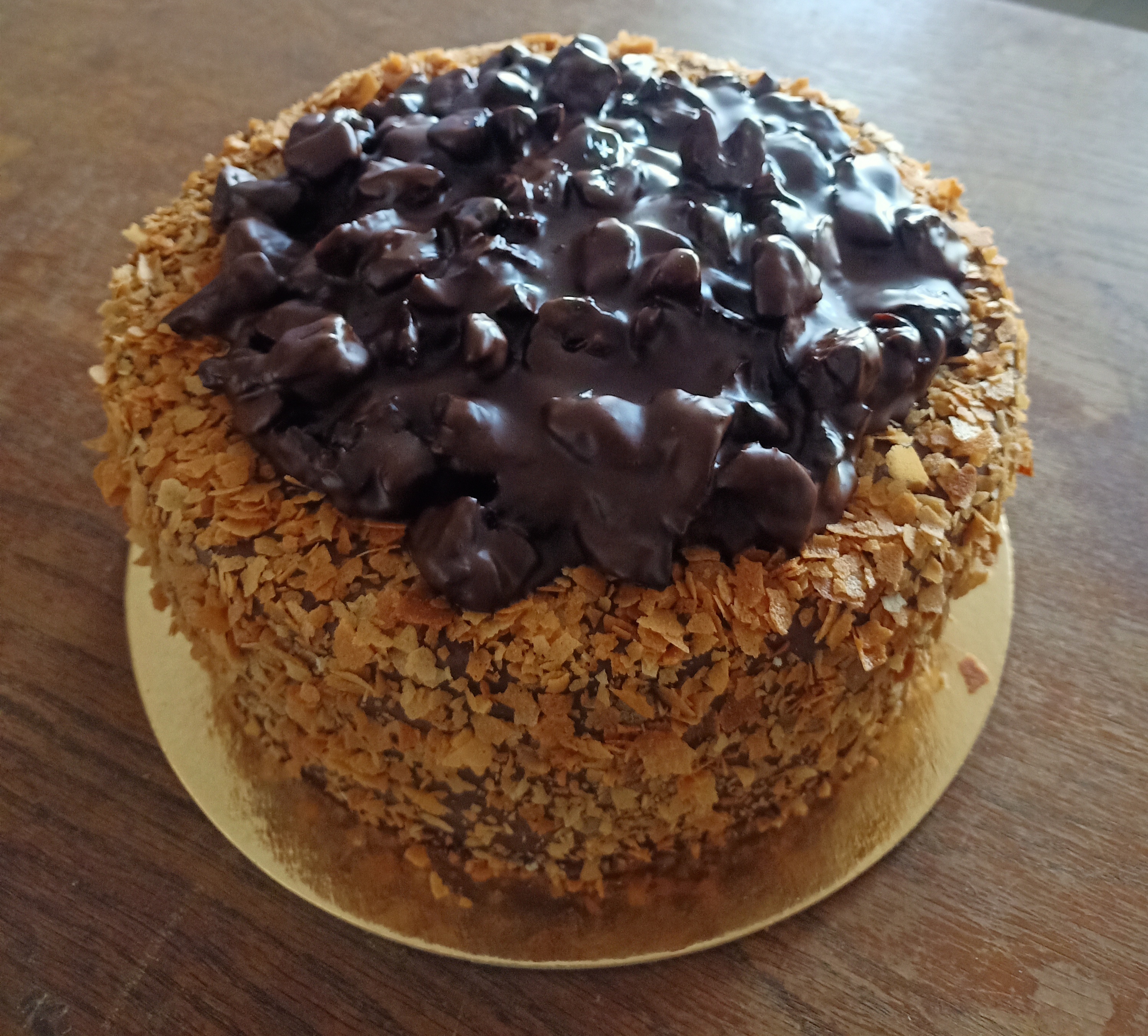 3 ciemne biszkopty przełożone śmietaną z konfiturą wiśniową, boki obsypane prażynką, góra wykończona ciemnym glacagem oraz rozetkami z kremu