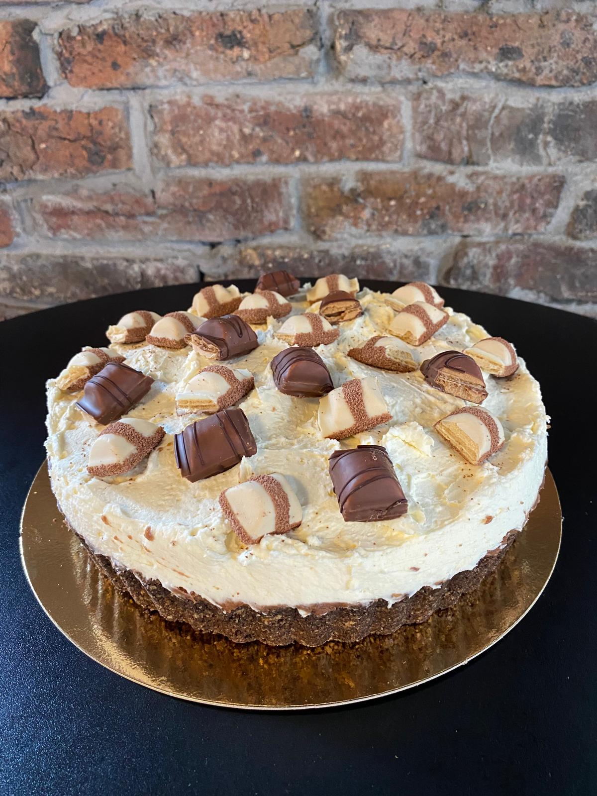 delikatny i kremowy sernik na kruchym spodzie oblany mleczną czekoladą, wykończony batonikami Kinder Buneno